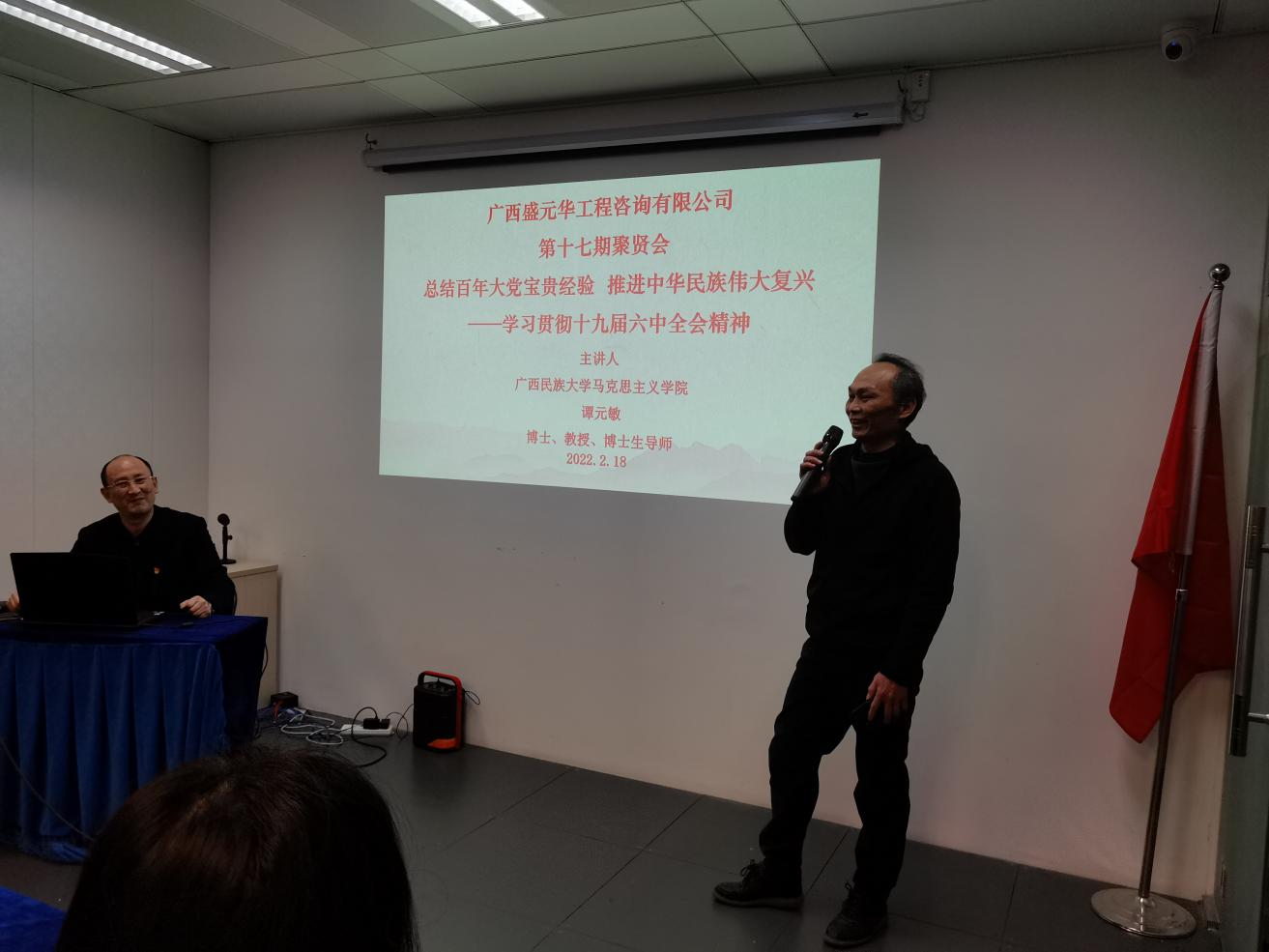 為豐富公司的黨建工作及企業(yè)文化建設(shè),公司于2月18日下午在總部會(huì)議室成功舉辦了第十七期期“聚賢會(huì)”互動(dòng)交流講堂活動(dòng)。本次“聚賢會(huì)”是以黨課的形式開(kāi)展學(xué)習(xí)十九屆六中全會(huì)精神的講堂活動(dòng),主題為“總結(jié)百年大黨寶貴經(jīng)驗(yàn)、推進(jìn)中華民族偉大復(fù)興,解讀十九屆六中全會(huì)精神”。 本期活動(dòng)邀請(qǐng)到的是廣西民族大學(xué)譚元敏教授蒞臨我公司授課,他用生動(dòng)的語(yǔ)言、精彩的PPT演示,使“聚友”們對(duì)黨的十九屆六中全會(huì)精神有了更深刻的理解。