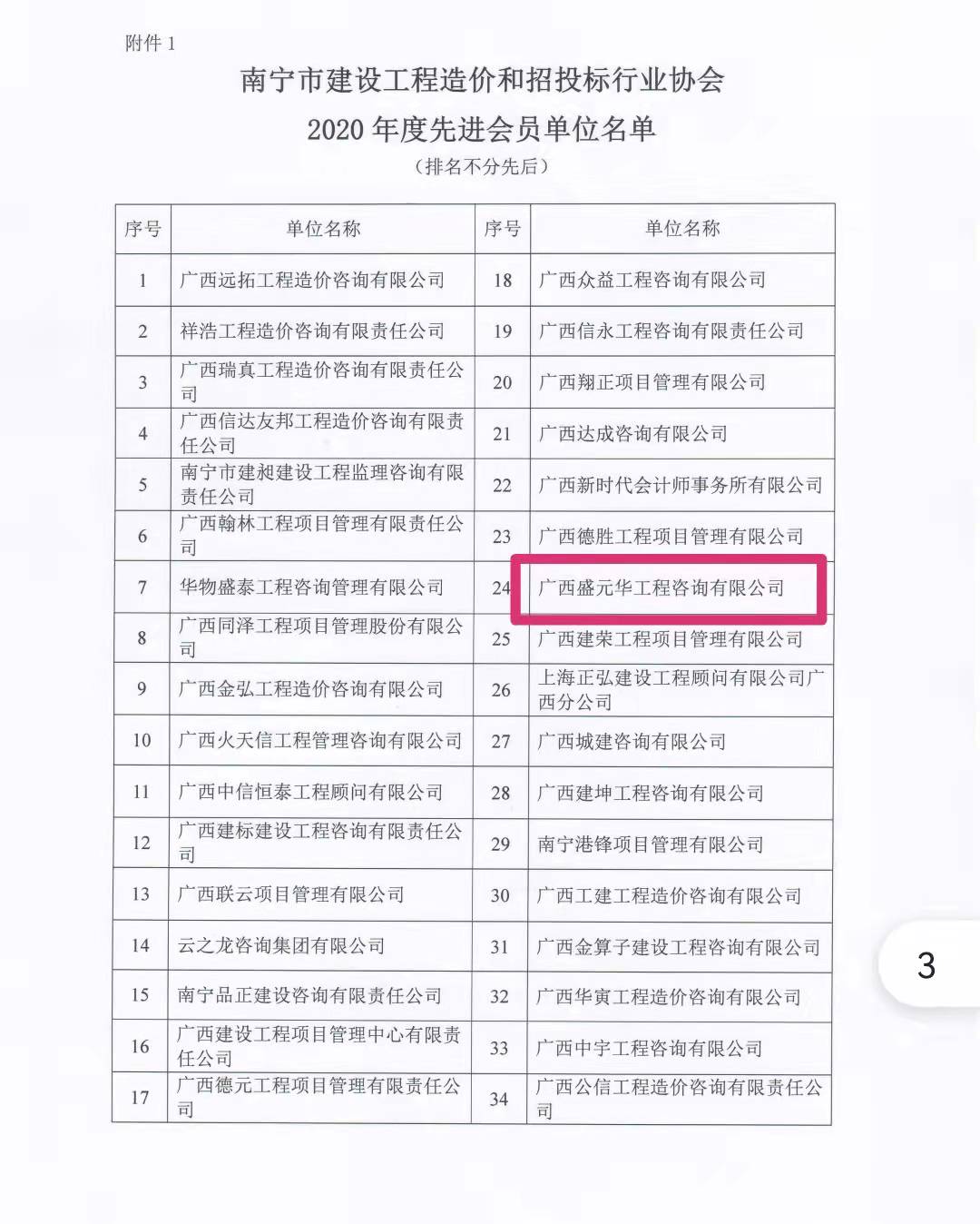 | 喜訊!熱烈祝賀廣西盛元華榮獲南寧市建設工程造價和招投標協(xié)會2020年度先進會員單位 |