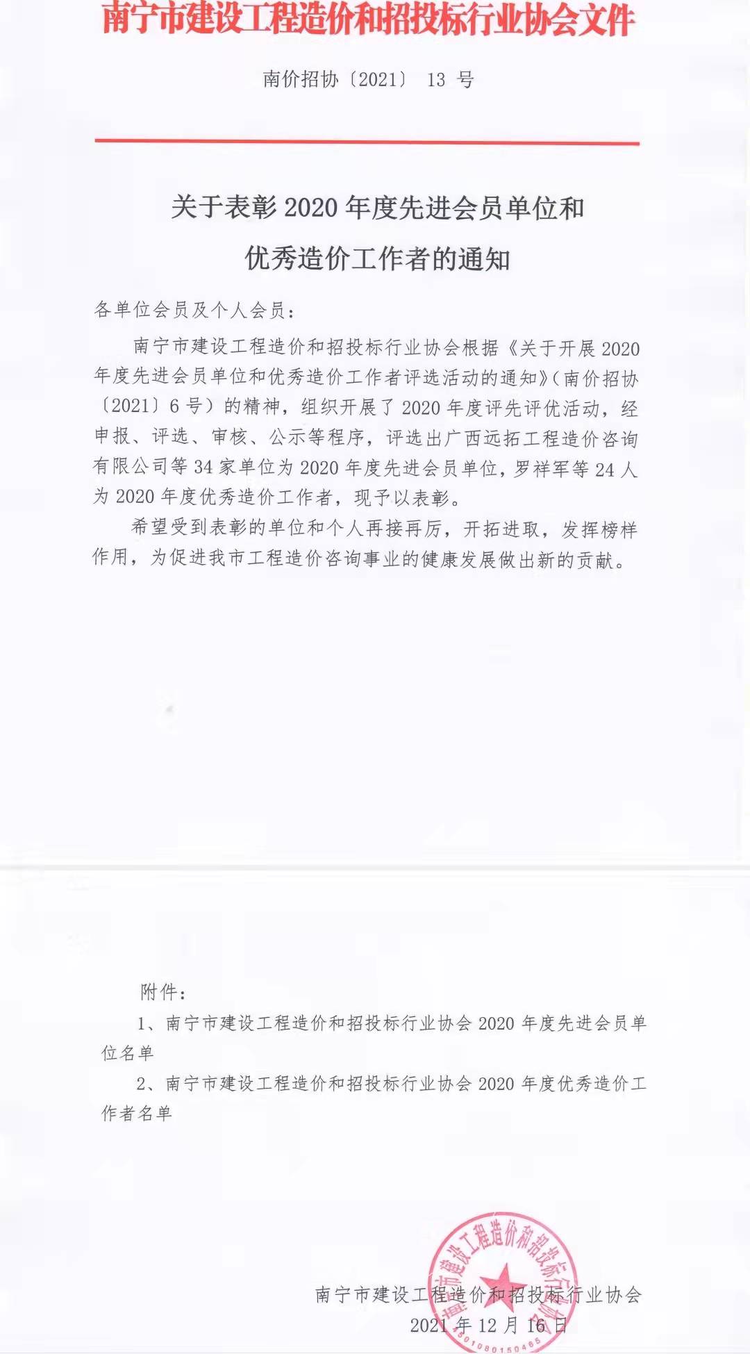 12月16日,南寧市建設工程造價和招投標協(xié)會發(fā)布年度評先評優(yōu)活動的表彰通知,我公司以優(yōu)秀的業(yè)績,良好的誠信評價,再次榮獲南寧市建設工程造價和招投標協(xié)會“2020年度先進會員單位”榮譽稱號。
